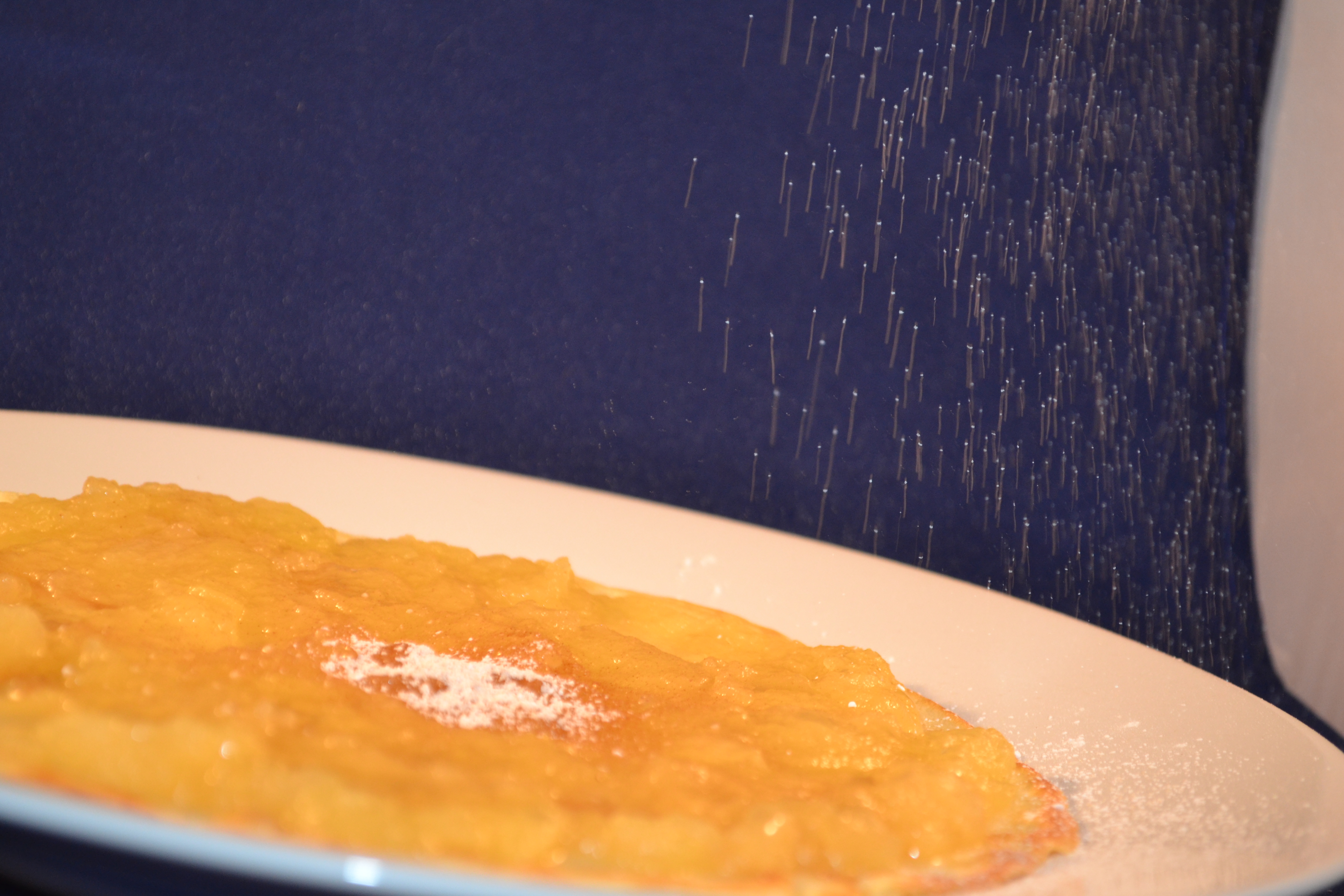 - Take one shop-bought large flat pancake. Use half of the Cameo puree and mix with a pinch of cinnamon and fresh or ground ginger to taste. Spread onto the pancake. Dust with icing sugar to taste