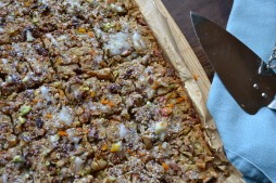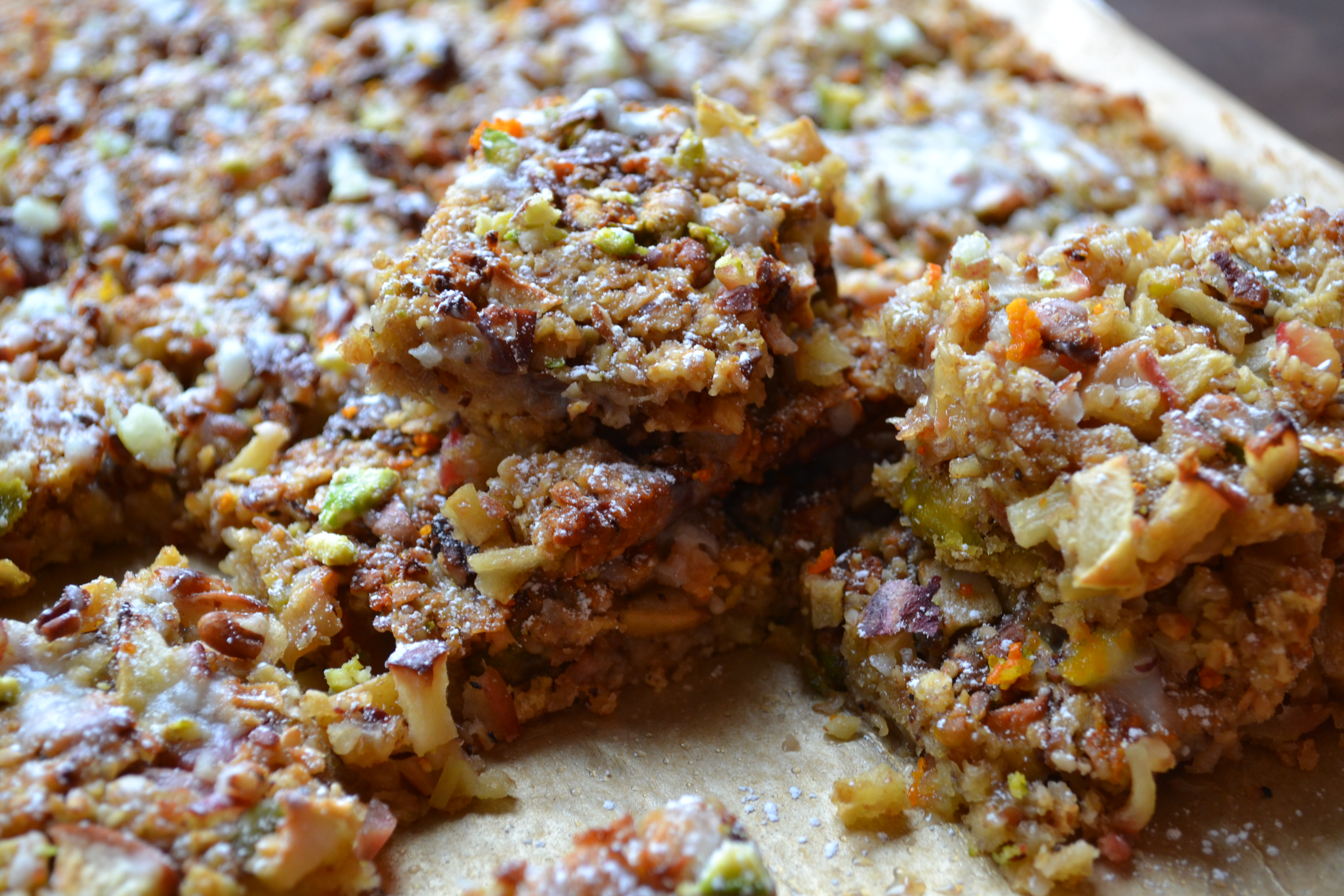 - Drizzle the icing over the cooled squares, along with the extra pecan nuts, pistachios and zest. Separate into bars and keep in a sealed container for up to 3 days.